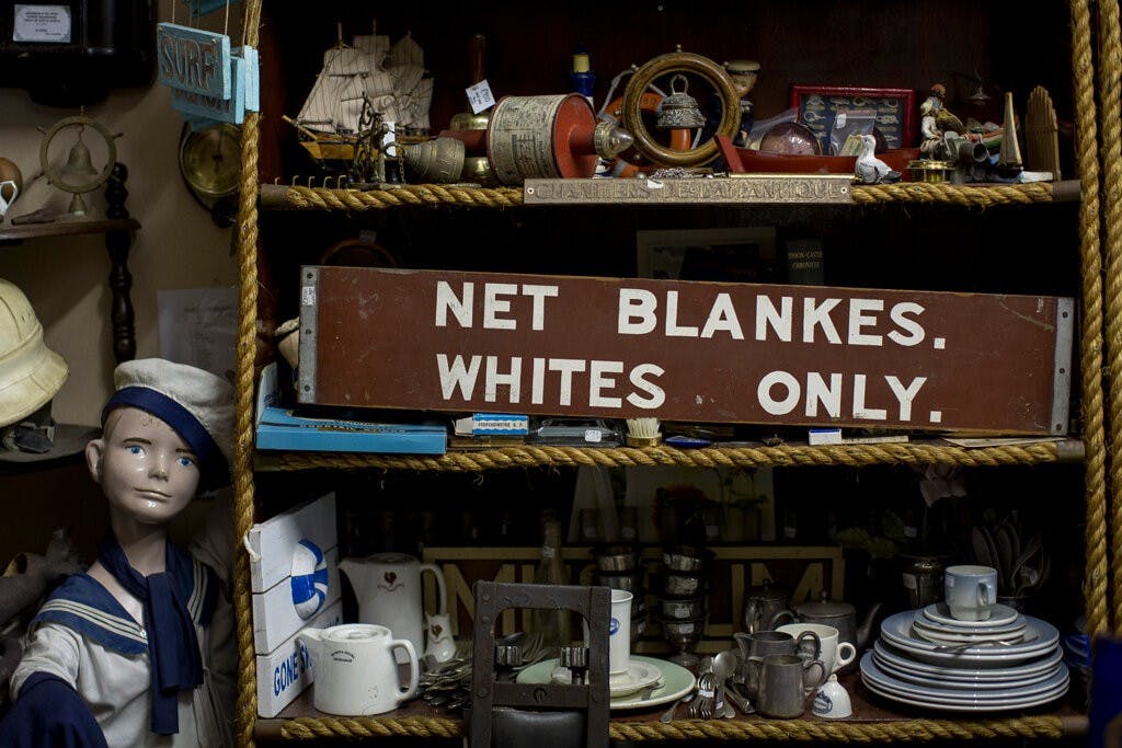 Between nautically themed shelves in the scenic seaside town of Hermanus in the Western Cape province of South Africa, bold white letters against a brown background read: “NET BLANKES. WHITES ONLY.” This once common sign of apartheid rests now slightly askew in Sydelle Willow Smith’s photograph, ‘Antique store, Hermanus, December 2017,’ echoing subtly the tilted head of an adjacent doll wearing a sailor’s uniform. The doll’s blue eyes stare out blankly, while scuff marks on his surface suggest he has seen better days.