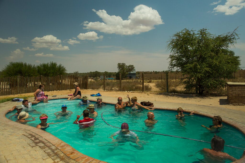 In the photograph ‘Kalahari Rest Stop, November 2016,’ Smith enters the exclusivity of the swimming pool, where the turquoise blue water offers a reprieve from desert temperatures and sunburn. On that scorching day, Smith was seeking relief for herself in the water. But the scene, in which a group of bronzed, white bodies gather in the pool under a big blue sky, also announced its apartness.