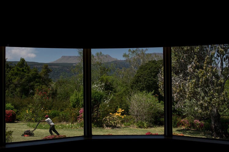 ‘Spring Garden, Hogsback, October 2018,’ features a large bay window that offers a triptych of the kind of grand landscape that has long inspired plein air painters and tourist agencies. Viewed from the darkened interior of the house, the landscape glows, almost like the glass case displays in natural history museums. It is as if this scene, too — like the stuff in the antique shop — is frozen in time. Against the mountains in the distance and vegetation, through the windowpane at the left, a black man mows the lawn. Something about the scene suggests strongly that this man owns neither the land that he works nor the house from which he is seen. But what is that something? How do we know so little and so much at the same time?