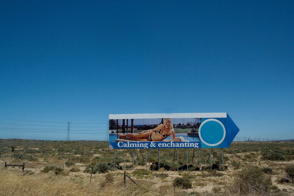In ‘West Coast Drive, November 2014,’ a billboard in the shape of an arrow points passers-by to a destination—or ostensibly a person, a blond woman reclining by an immaculate swimming pool—and a promise of an easy living. The text below her reads: “Calming & enchanting.”