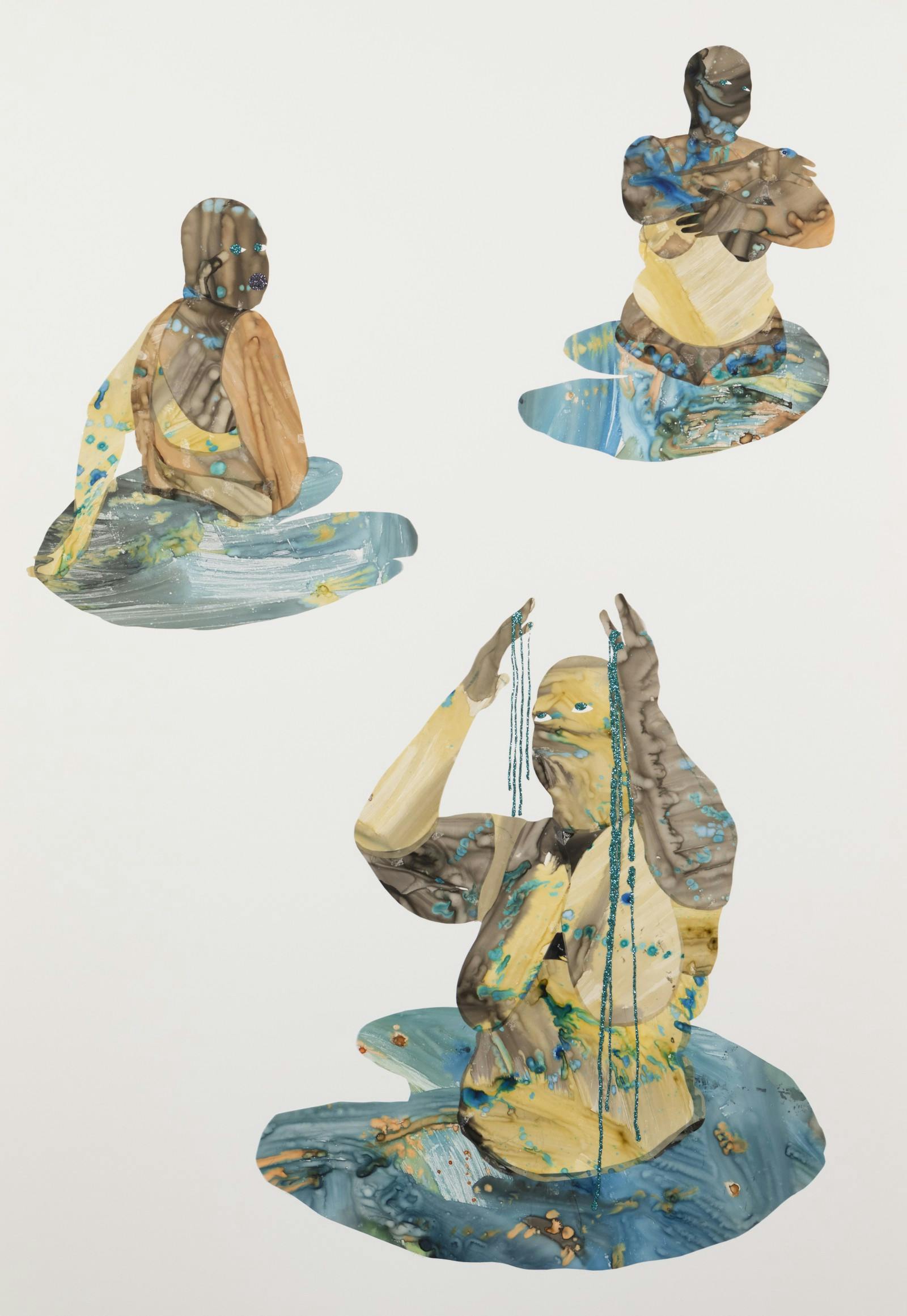 "Black womanhood is a dynamic archive of knowledge, formed of flesh, spirit, and memory. In my practice, I explore Black femininities against the backdrop of my own biography. Using a mixture of mylar, ink, pigment, and glitter, I create depictions of voluptuous, curvaceous bodies that simultaneously appear weightless -floating, as if viewed from below, transcending some higher plane. These otherworldly women hover over a nebulous world, in which they have the power to divine the future, move across time, or heal. Through the breaking down and reconstruction of images, I'm attempting to develop an altered context in which a new kind of mythology around the Black female heroine can emerge."